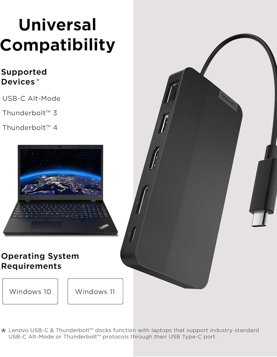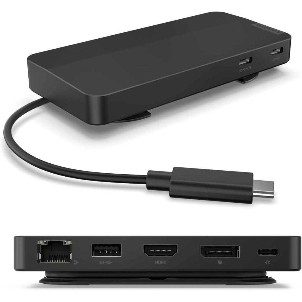 Lenovo USB-C Dual Display Travel Dock w/ 100W Power Adapter - 7 Ports, Integrated USB-C Cable, Universal Compatibility, Dual Displays at 4K - Black(USB Dock)